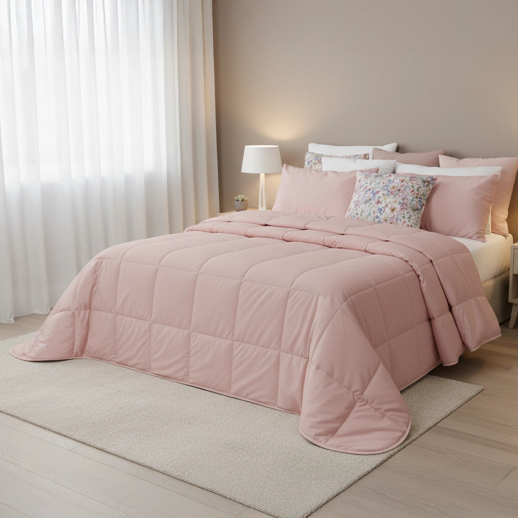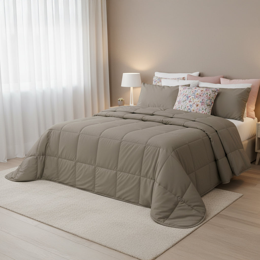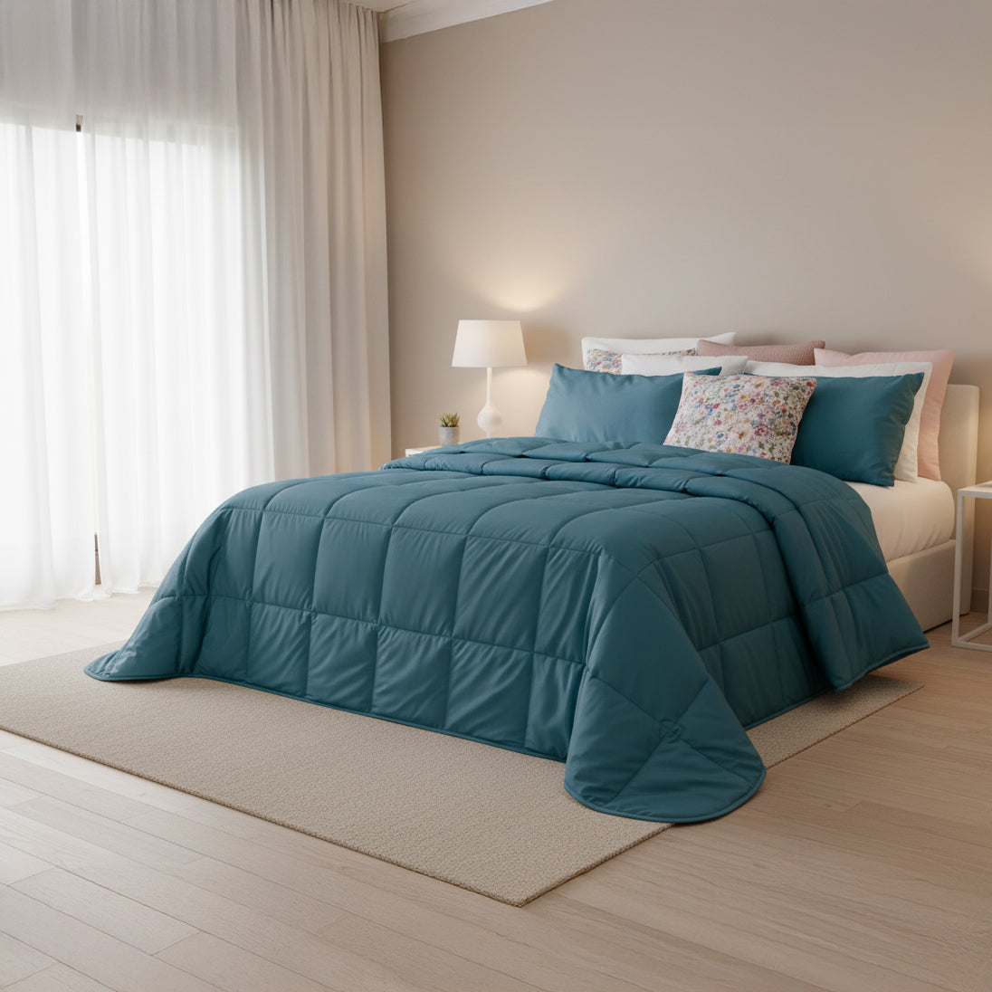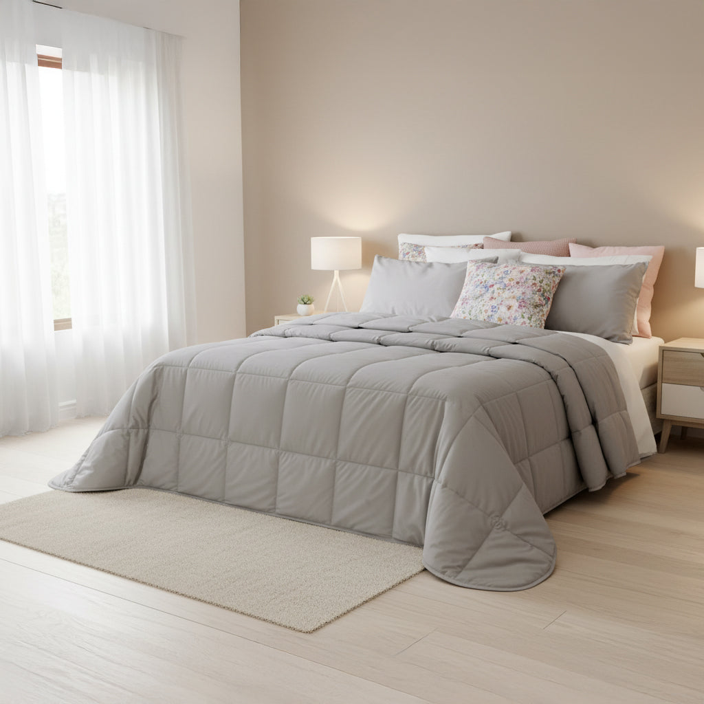 O enchimento de 150 g/m² confere leveza e conforto térmico equilibrado, tornando esta colcha perfeita para utilização durante todo o ano, especialmente em meia-estação. As almofadas incluídas completam o conjunto, criando um acabamento harmonioso e bem cuidado.