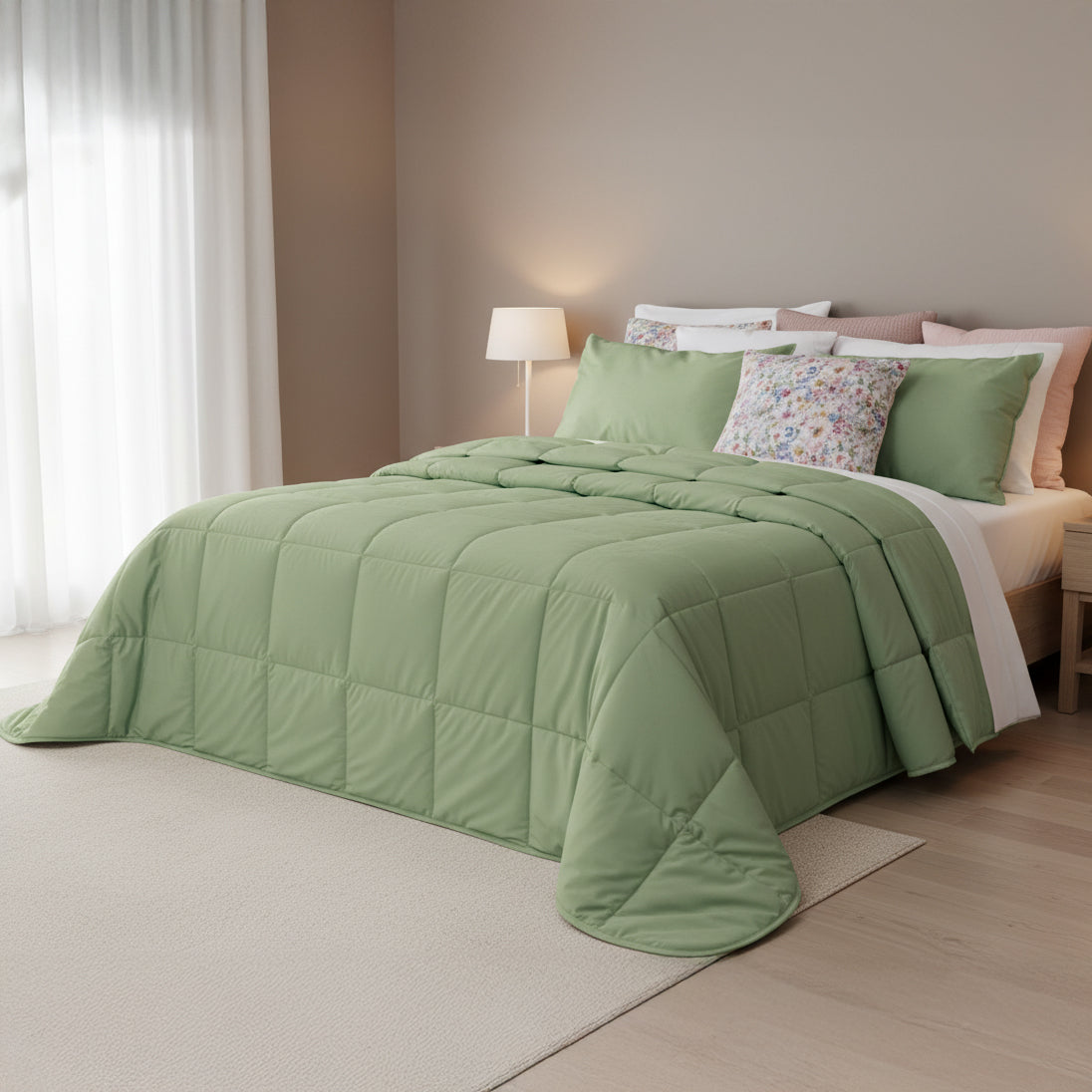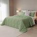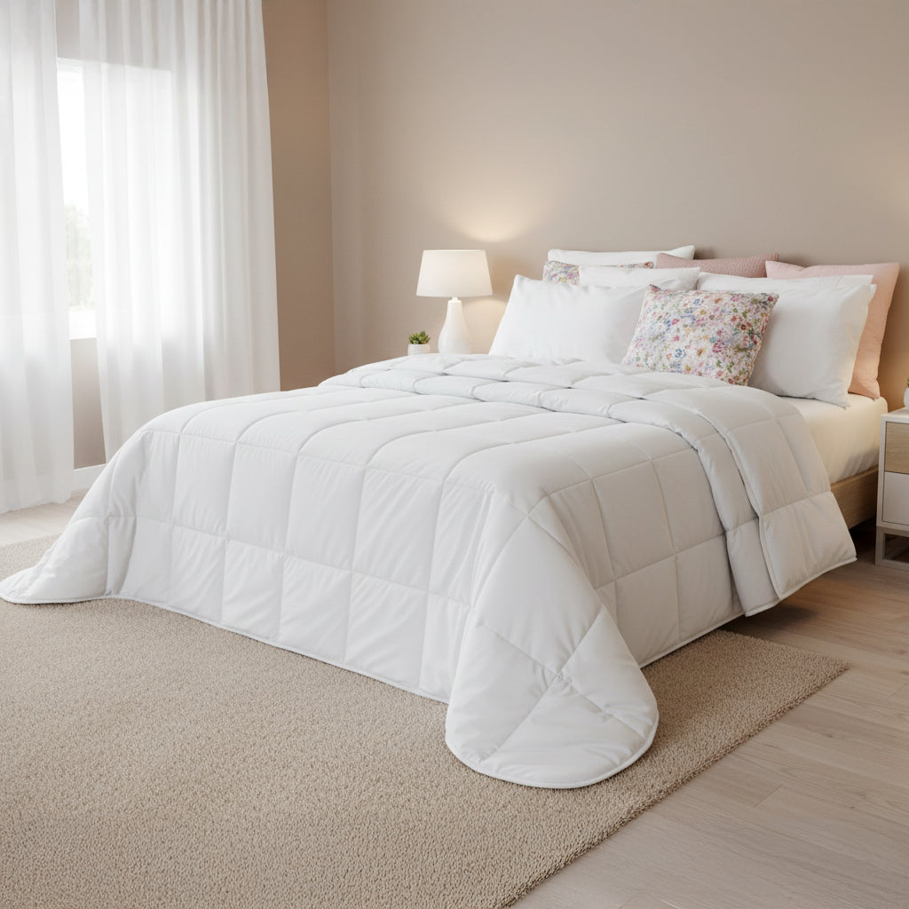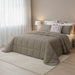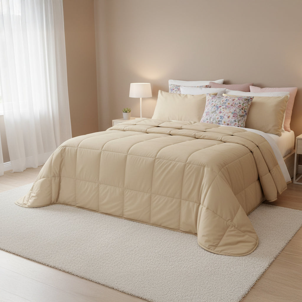 O enchimento de 150 g/m² confere leveza e conforto térmico equilibrado, tornando esta colcha perfeita para utilização durante todo o ano, especialmente em meia-estação. As almofadas incluídas completam o conjunto, criando um acabamento harmonioso e bem cuidado.