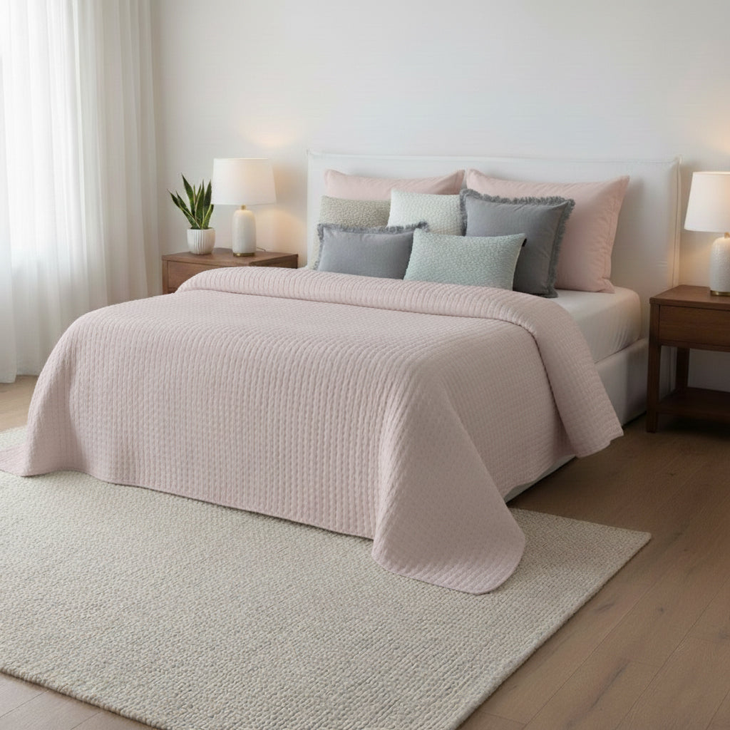 Com um design simples e elegante, esta colcha bouti é ideal para quem procura um ambiente leve, acolhedor e visualmente equilibrado. O seu padrão discreto adapta-se facilmente a diferentes estilos de decoração, desde os mais modernos aos mais intemporais. Confeccionada em tecido de elevada qualidade e com enchimento de 100 g/m², é perfeita para os meses de primavera e verão, oferecendo conforto sem excesso de calor.