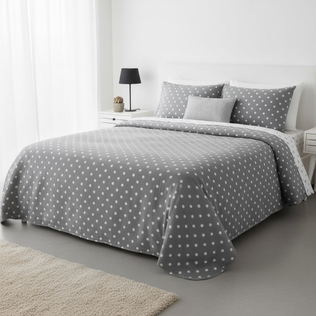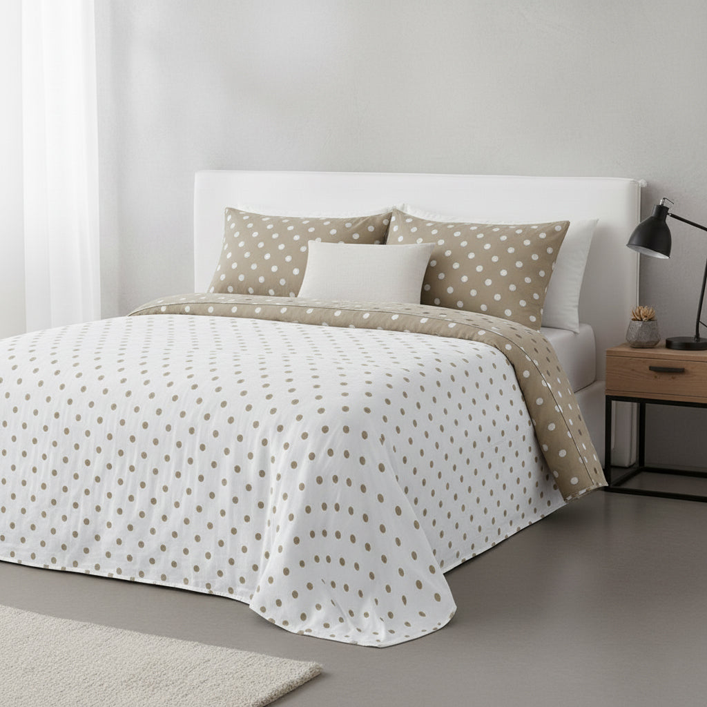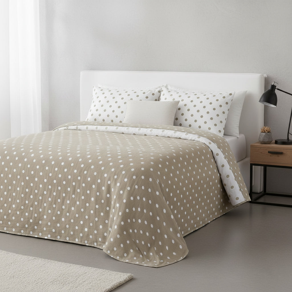 Com um padrão geométrico de círculos, esta colcha bouti reversível é a escolha ideal para quem aprecia um estilo minimalista, moderno e acolhedor. O design leve e equilibrado adapta-se facilmente a diferentes decorações, trazendo luminosidade e elegância ao quarto. Confeccionada em tecido de elevada qualidade, garante conforto e um excelente acabamento.