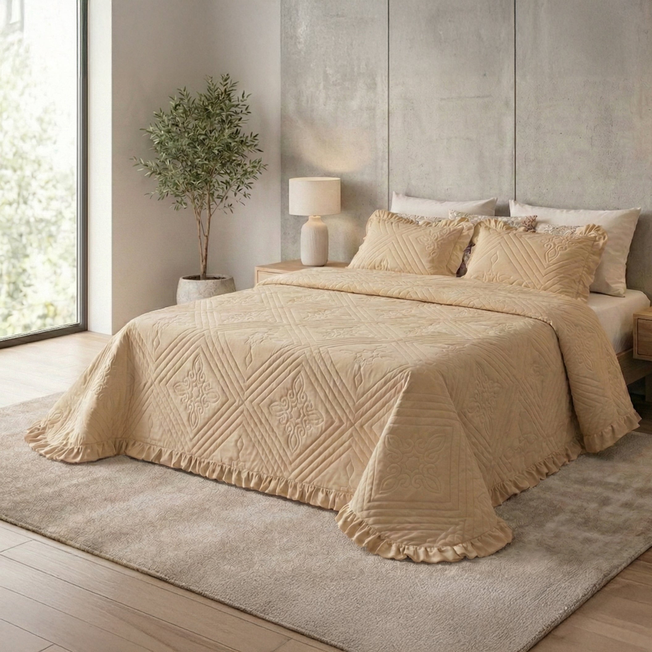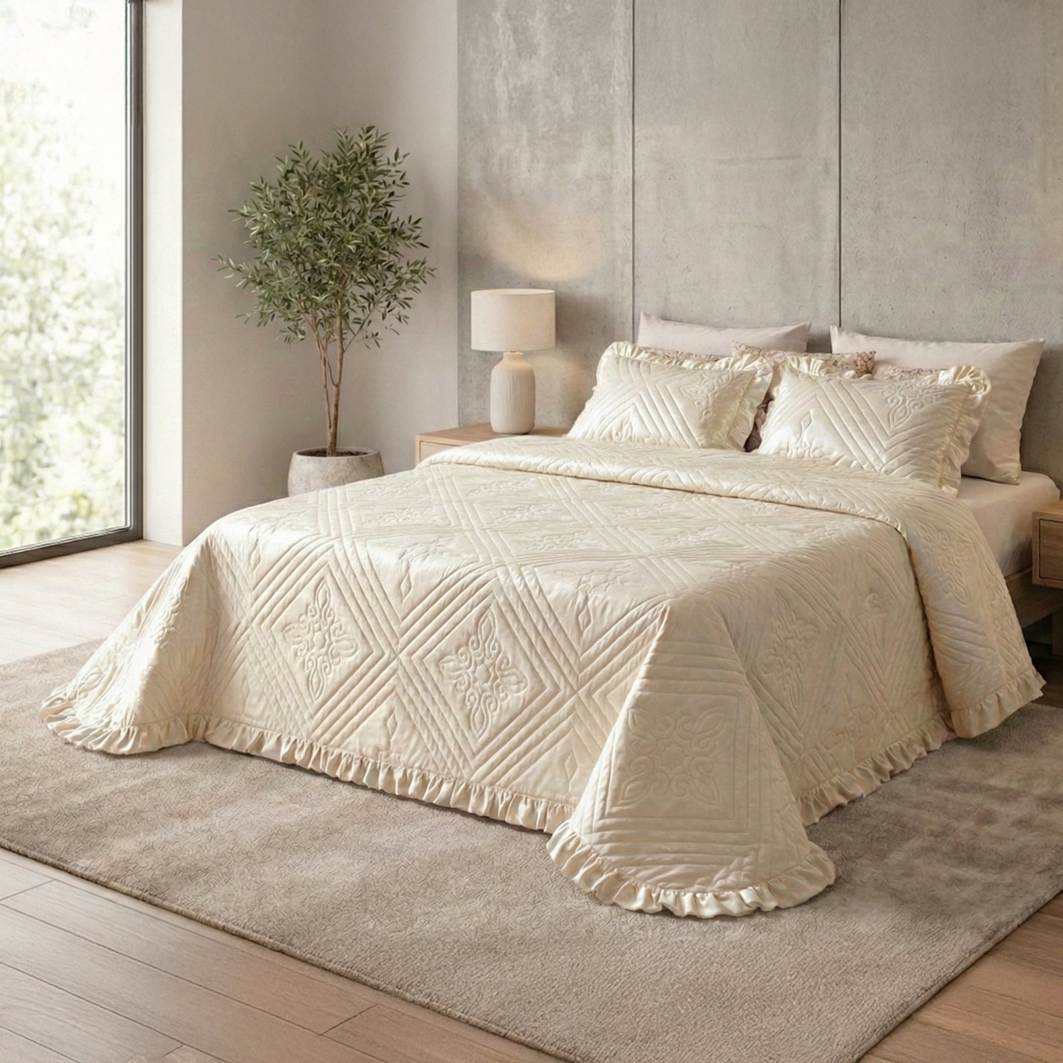 Desenho em Relevo - O padrão trabalhado em relevo valoriza o conjunto, conferindo profundidade visual e elegância discreta que eleva a decoração do quarto.