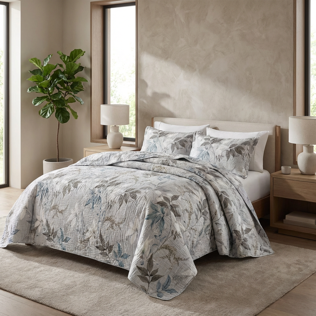 A Colcha Bouti Botânica é a escolha perfeita para quem deseja aliar sofisticação e bem-estar. Com uma estampa delicada de folhagens em tons suaves e modernos, ela transforma instantaneamente a decoração do quarto, criando uma atmosfera acolhedora e leve.