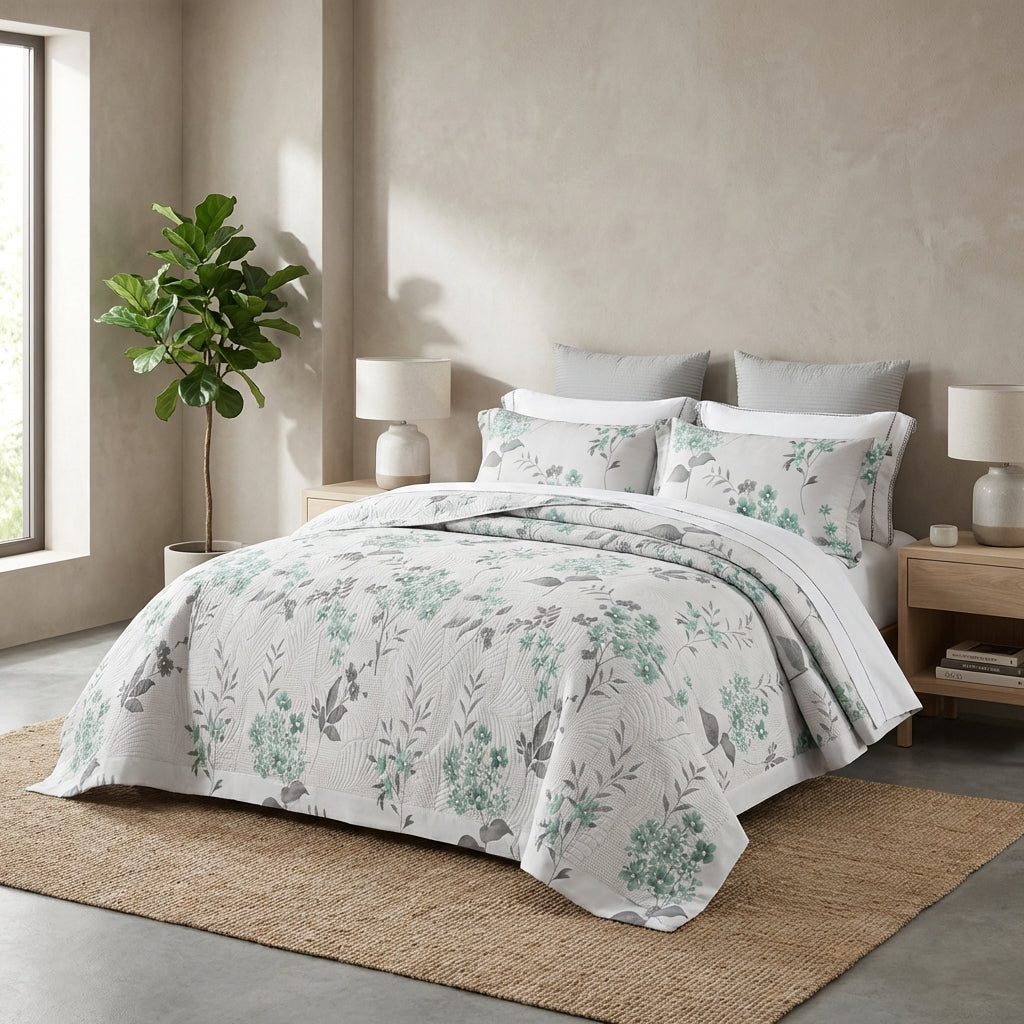 Colcha de Casal Botânica Verde e Cinza com 2 Fronhas