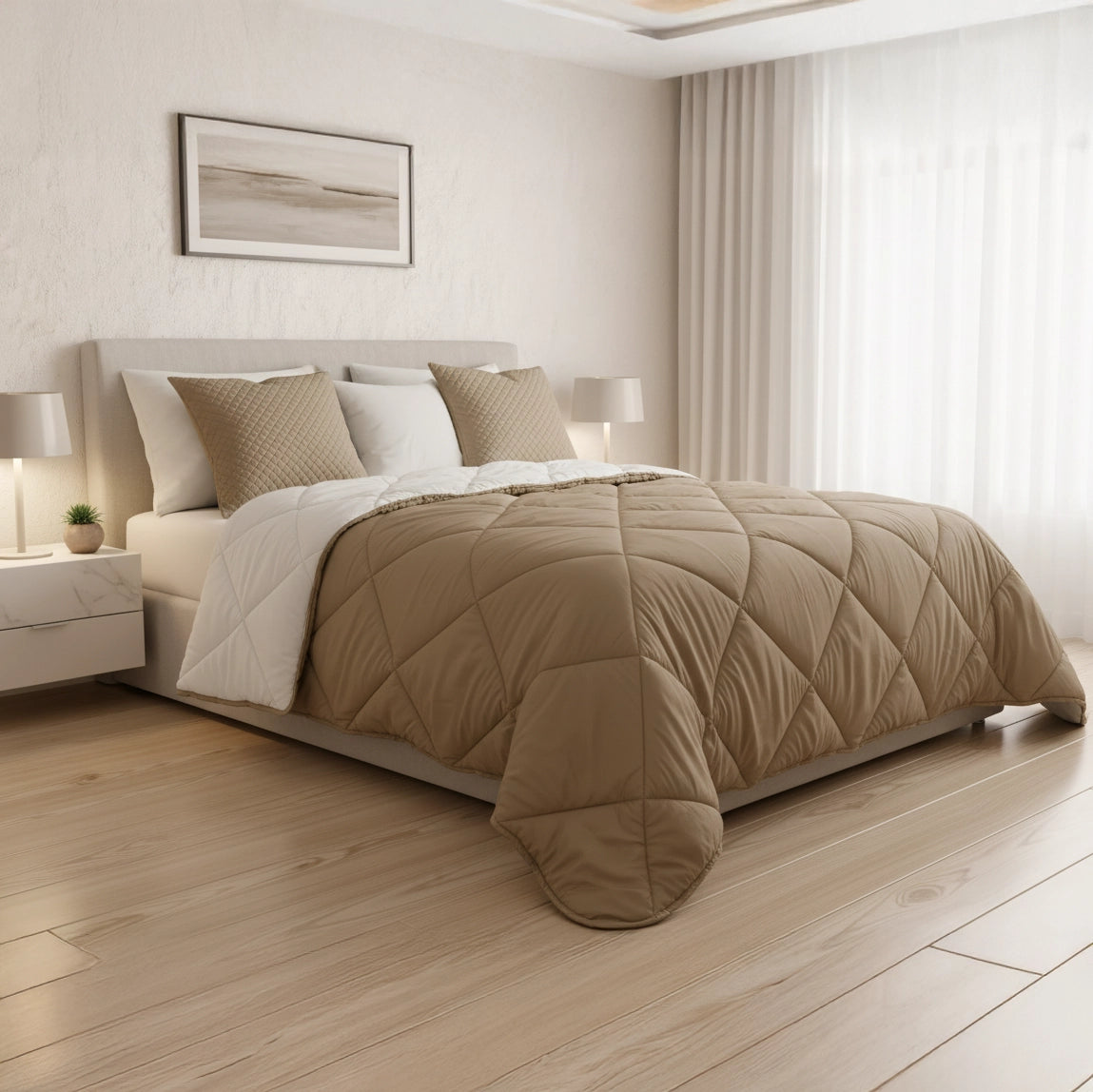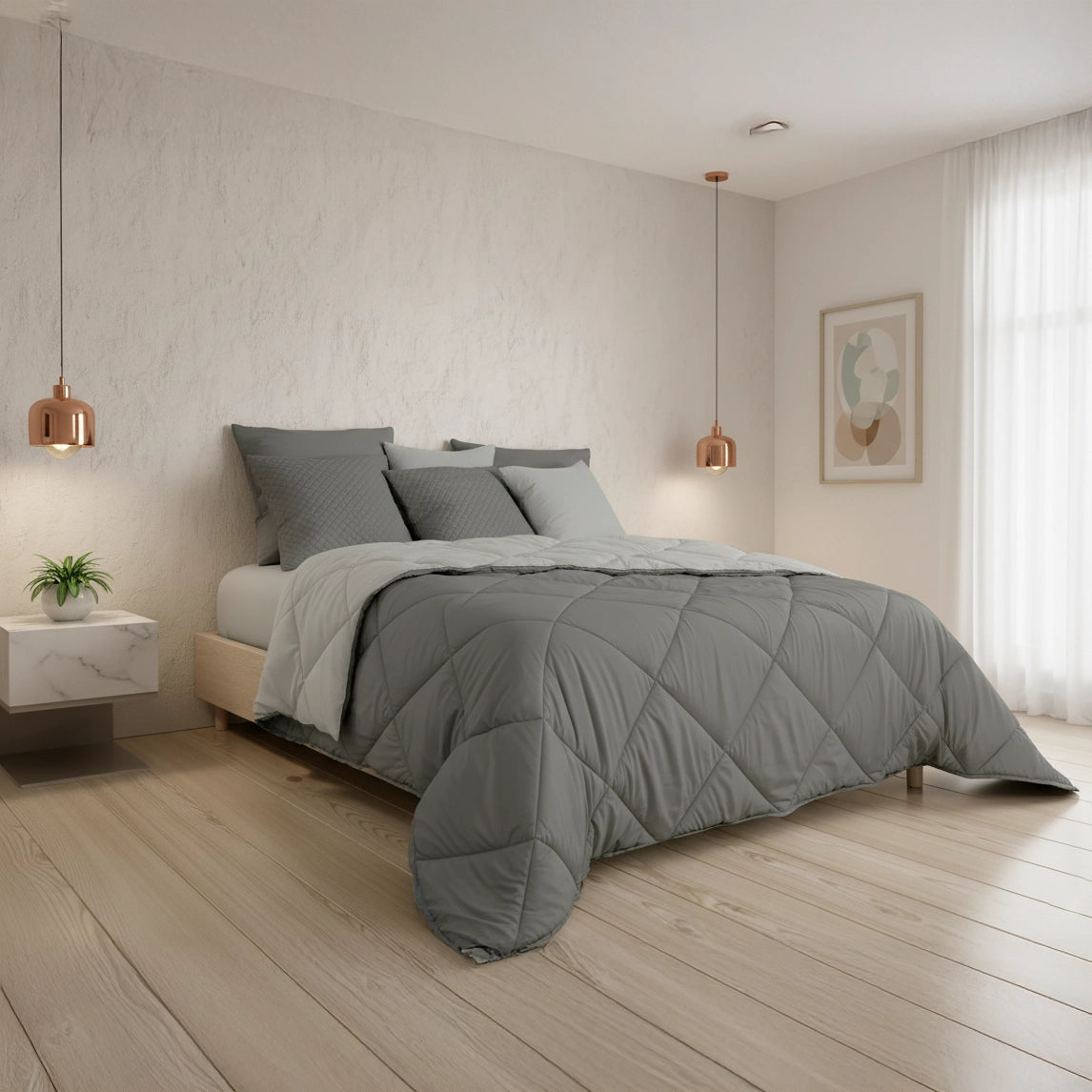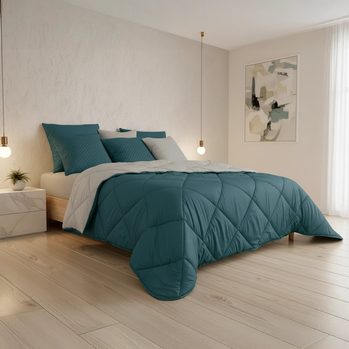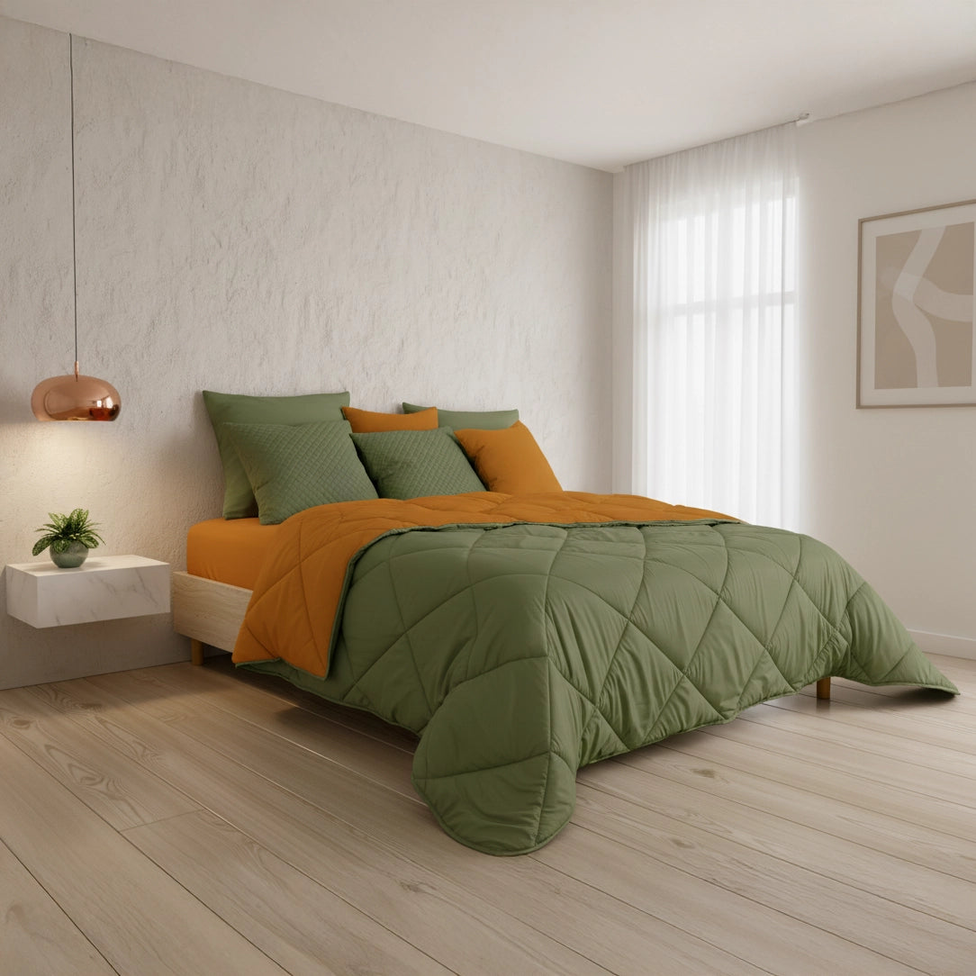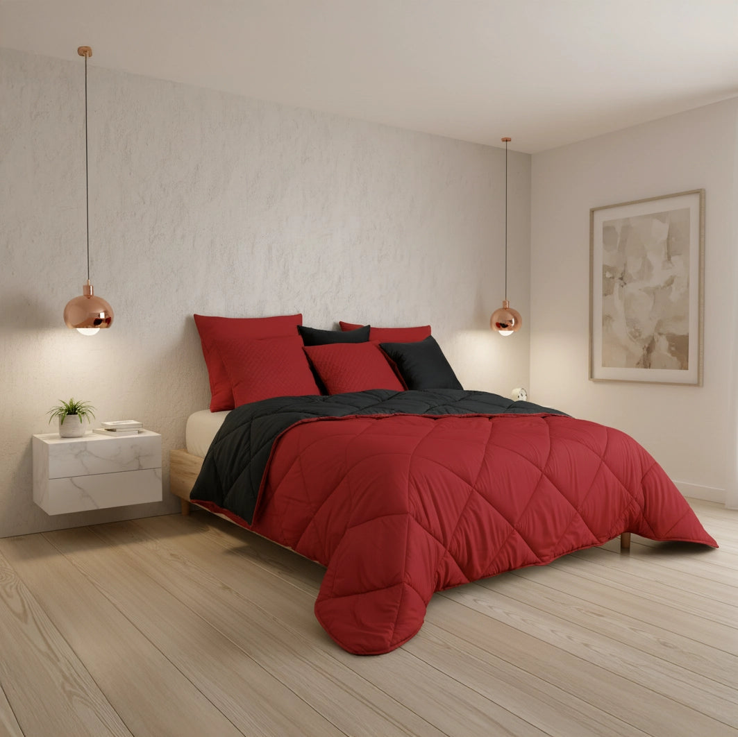 Com um design dupla face, este edredão oferece a versatilidade de ter duas cores ou texturas distintas em uma única peça, permitindo-lhe mudar o visual do seu quarto rapidamente. O seu enchimento proporciona o volume e o calor ideais para um descanso aconchegante.