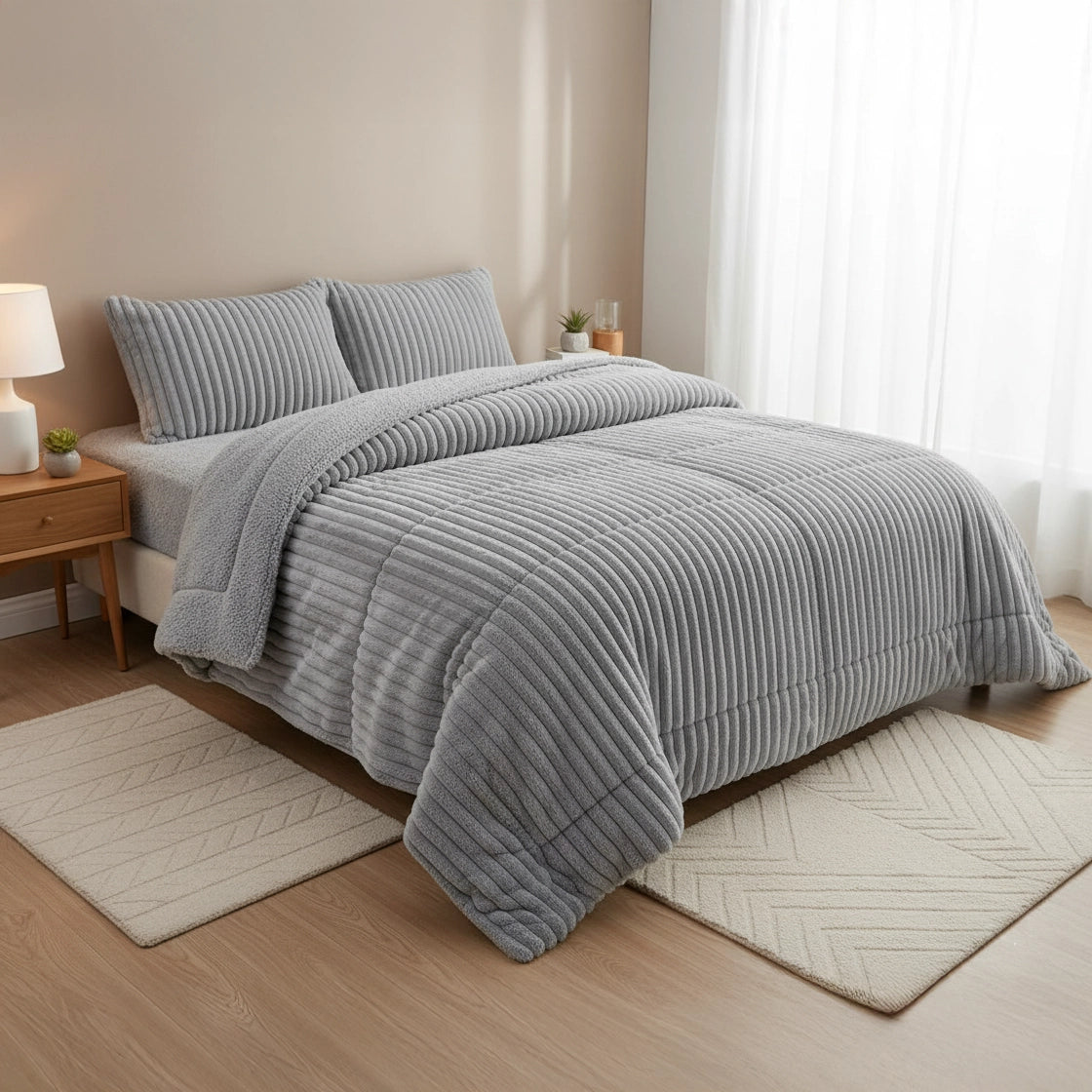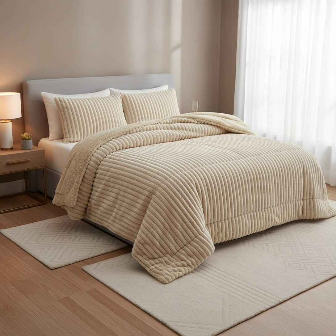 O Edredon Boreal foi criado para elevar o conforto do seu descanso, oferecendo um toque excepcionalmente macio e sedoso, ideal para quem procura máximo aconchego durante o inverno. O seu interior em sherpa à cor proporciona um efeito calor envolvente, mantendo a temperatura perfeita ao longo da noite.