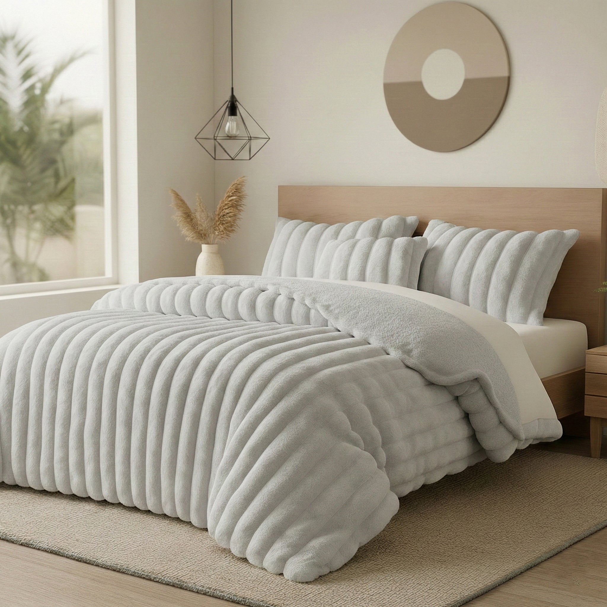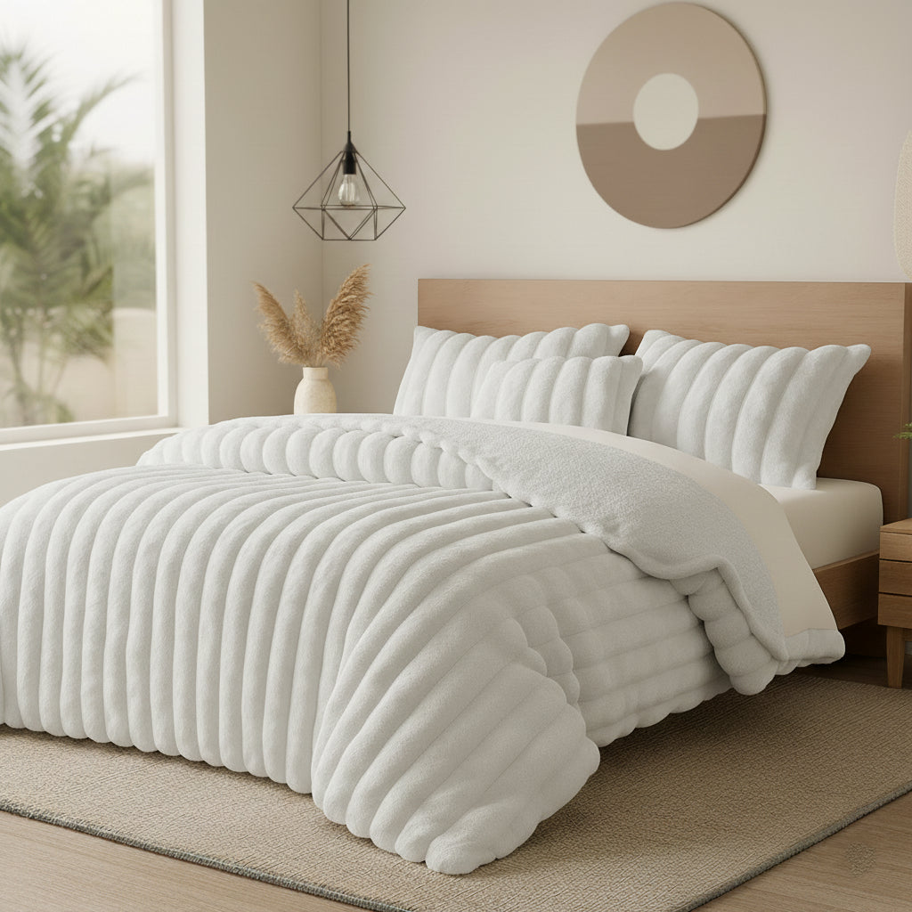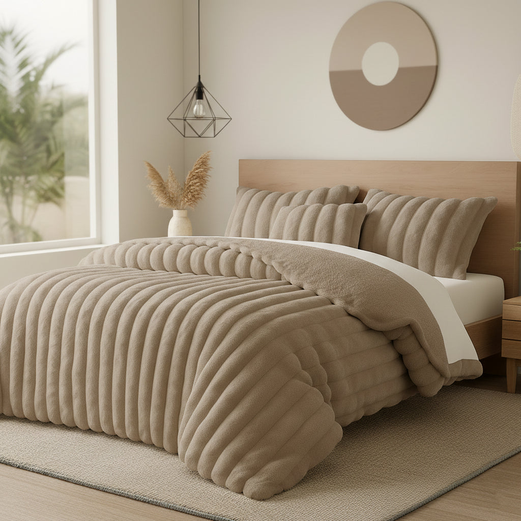 O Edredon Macarena foi criado para quem valoriza conforto absoluto e um toque de elegância no quarto. Confeccionado em microcoralina canelada efeito rabbit fur, oferece uma suavidade extraordinária, envolvente e luxuosa, como um verdadeiro abraço térmico. A textura canelada acrescenta profundidade e modernidade ao design, tornando-o uma peça decorativa de destaque.