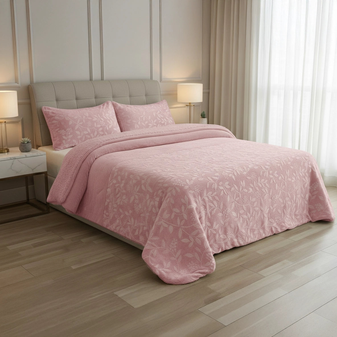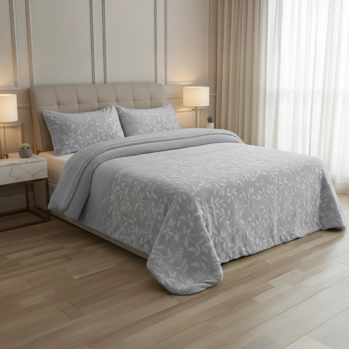 Destaque em Textura e Design: O diferencial deste edredon é o seu tecido de alta qualidade: a Microcoralina Jacquard. Esta superfície extremamente suave apresenta um elegante padrão em relevo (jacquard), conferindo um toque sofisticado e uma textura visualmente rica que transforma imediatamente a decoração do seu ambiente.