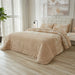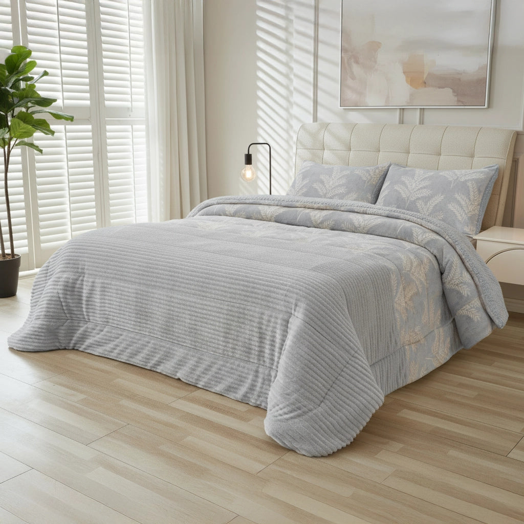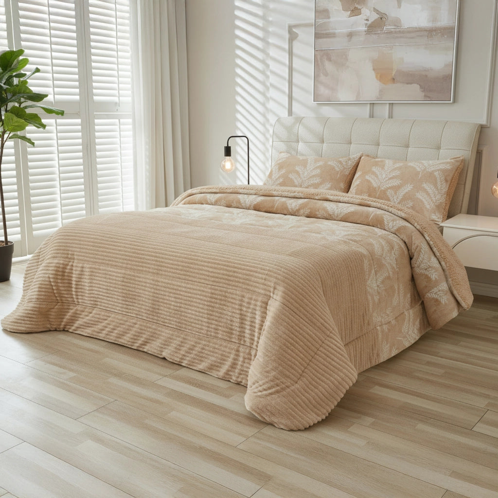 Destaque em Textura e Design: O diferencial deste edredon é o seu tecido de alta qualidade: a Microcoralina Jacquard. Esta superfície extremamente suave apresenta um elegante padrão em relevo (jacquard), conferindo um toque sofisticado e uma textura visualmente rica que transforma imediatamente a decoração do seu ambiente.