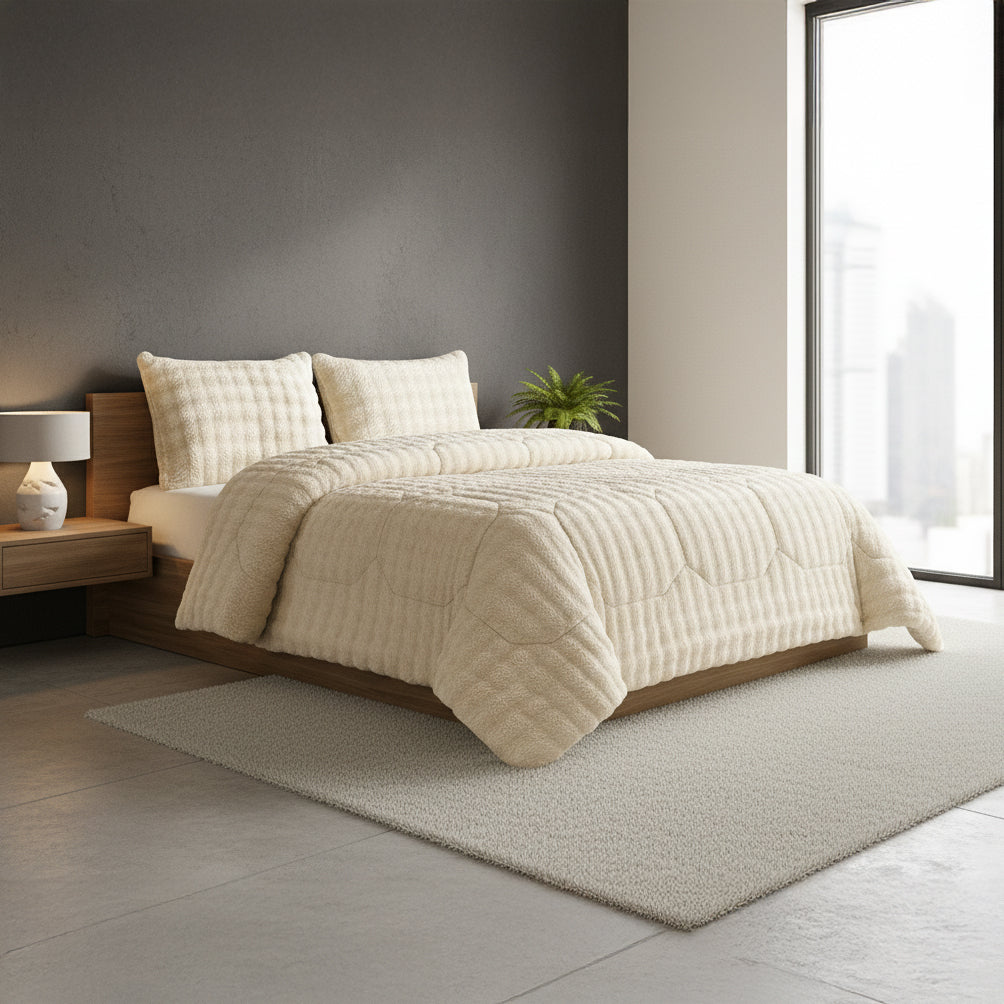 Transforme o quarto num verdadeiro refúgio de conforto e elegância com o Edredon Pelo de Borrego Núvem. Desenvolvido para proporcionar máximo aconchego nas noites frias, combina o toque ultra macio do rabbit fur no exterior com um interior em sherpa à cor, criando uma sensação envolvente, quente e extremamente confortável.