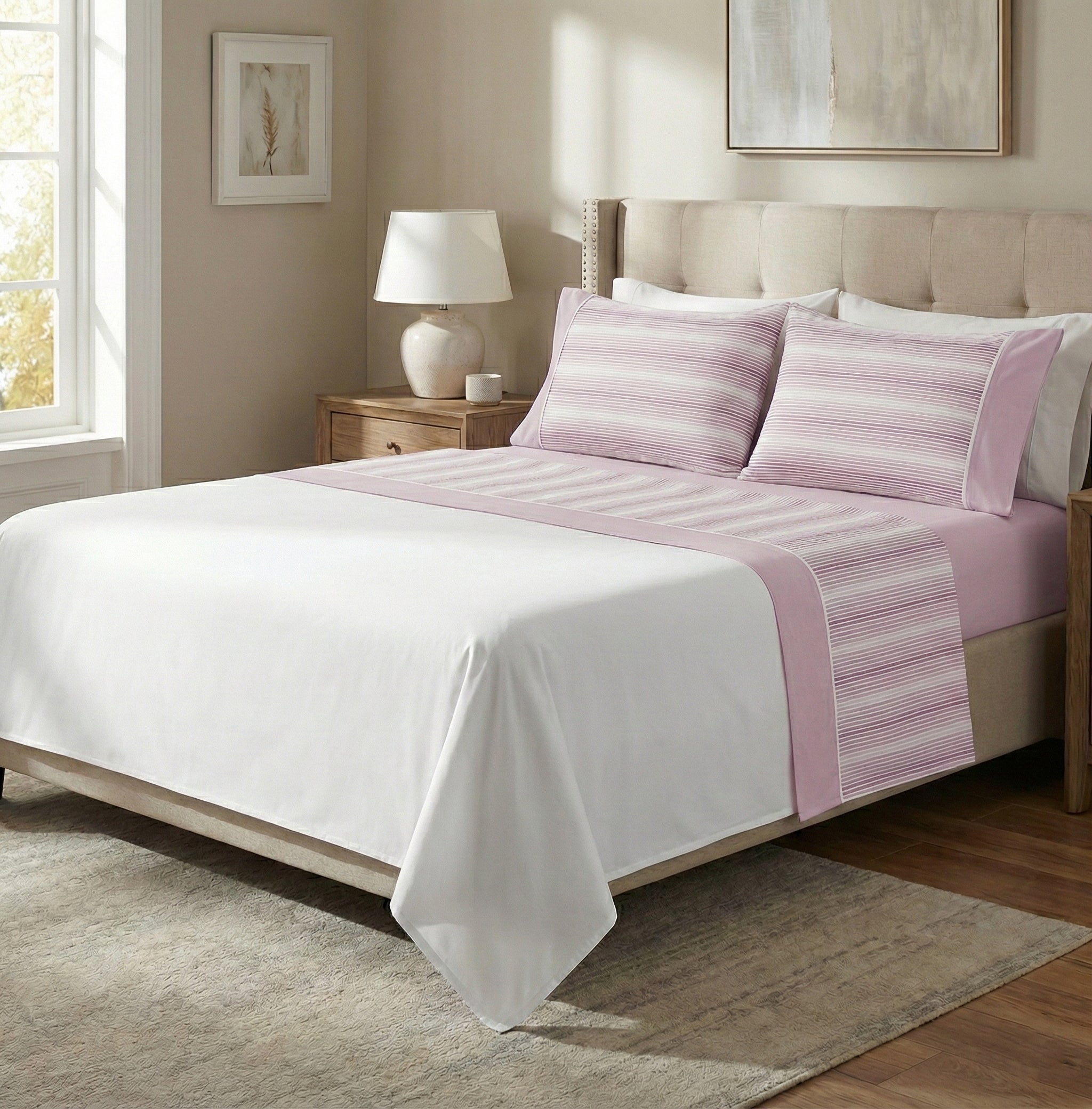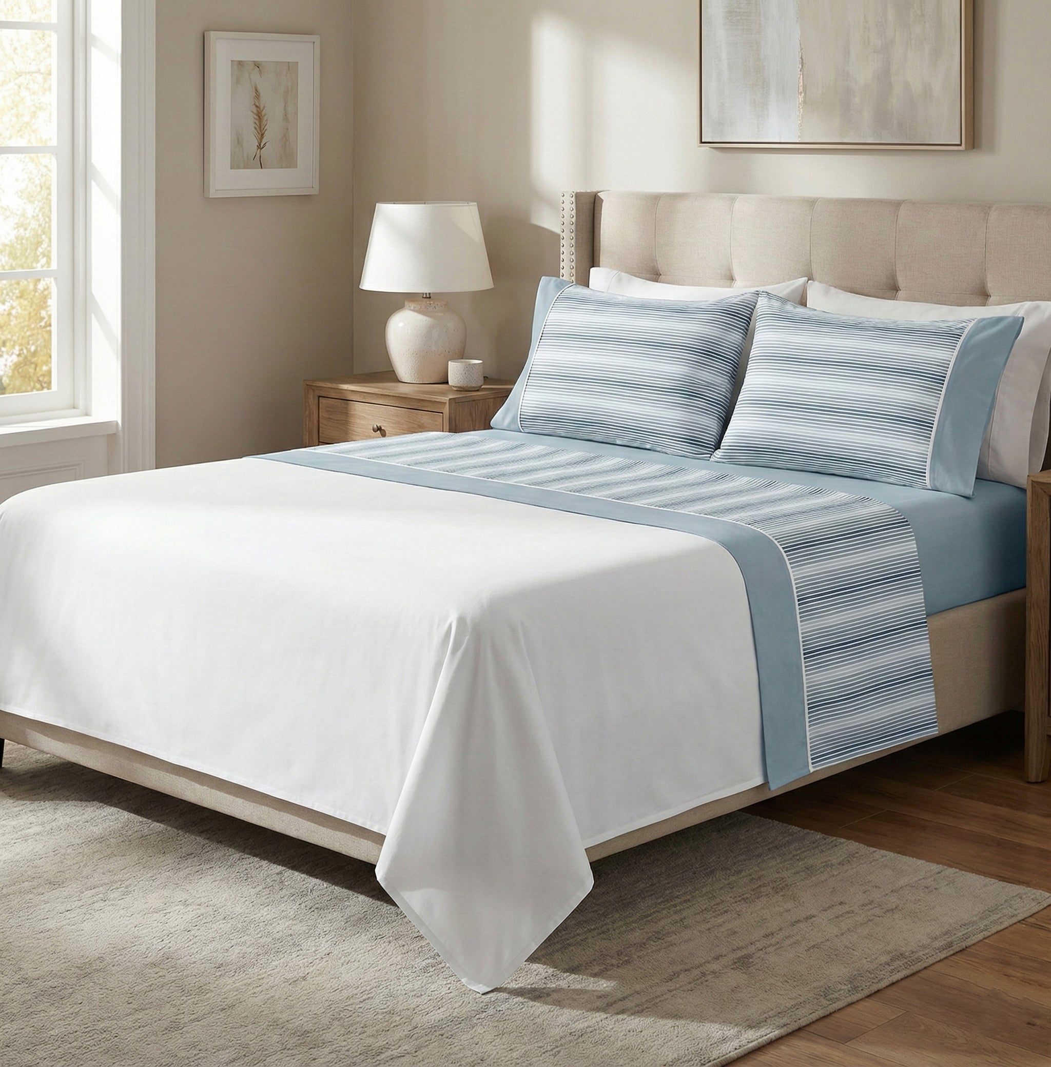 Conjunto de lençóis que se destaca pelo padrão de riscas finas e delicadas, que criam um efeito visual leve, moderno e intemporal. O lençol de cima apresenta a zona central estampada com riscas subtis, rematada por uma barra lisa que enquadra o desenho e confere um acabamento harmonioso e refinado. As fronhas seguem o mesmo conceito, combinando o padrão listado com aplicação lisa lateral, criando equilíbrio e sofisticação. O lençol de baixo é totalmente liso, garantindo um visual clean e versátil que se adapta a qualquer decoração de quarto.